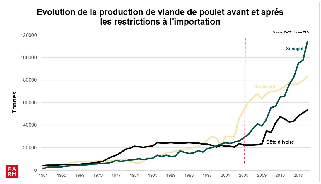 Senegal isn't the only African country protecting its poultry sector. Cameroon restricted its imports of chicken cuts between 2005 and 2016. This measure encouraged the development of local production, which increased by half between 2005 and 2019, creating thousands of jobs. Similarly, since 2005 in Côte d'Ivoire, the implementation of an import tax of €1.50 per kilo on chicken cuts has allowed the poultry industry to take off (+83 % between 2005 and 2019).